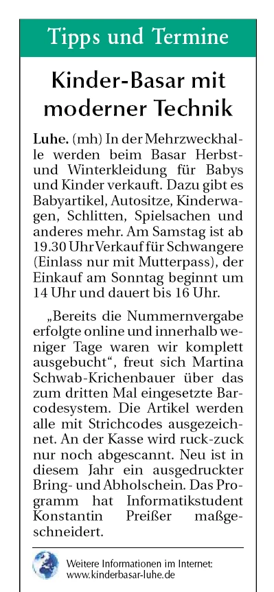 Unser nächster Basar ist am . Anmeldung für Anbieter ist online möglich ab ; für Helfer ab .
